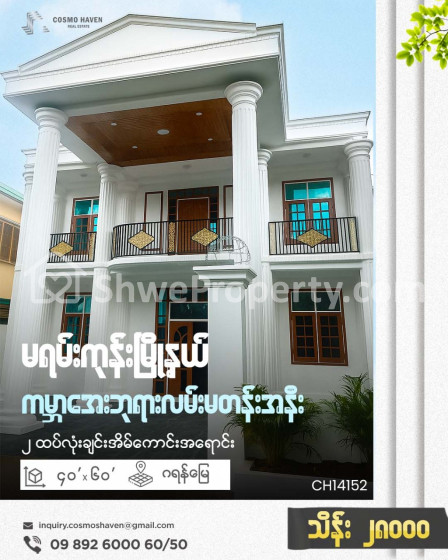 🏠မရမ်းကုန်းမြို့နယ်ကမ္ဘာအေးဘုရားလမ်းမအနီးရှိအသင့်နေ၂ထပ်လုံးချင်းအိမ်အသစ်လေးနဲ့မိတ်ဆက်ပေးပါ့မယ်ရှင်