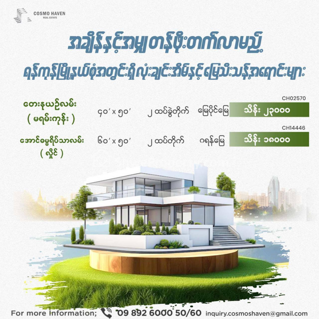 🏡 📌🏘️⏰အချိန်နှင့် အမျှ တန်ဖိုးတက်လာမည့် ရန်ကုန်မြို့နယ်စုံအတွင်းရှိ လုံးချင်းအိမ်နှင့် မြေသီးသန့်အရောင်းများကို အထူးဈေးနှုန်းဖြင့် ရွေးချယ်ဝယ်ယူနိုင်ရန် Cosmo Heaven Estate ကို အမြန်ဆုံး ဆက်သွယ် ရွေးချယ် ဝယ်ယူနိုင်ပါပြီ 📞📞