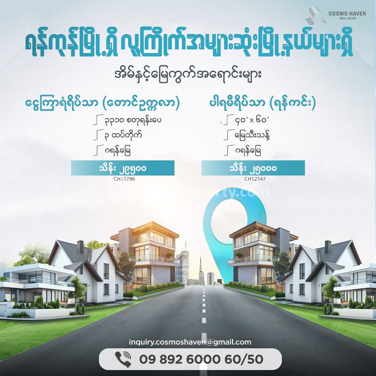 🏡 📌🌆🏡🗼ရန်ကုန်မြို့အတွင်း ဈေးနှုန်းအသင့်တင့် လေးနဲ့ အချက်ချာကျပြီးလူစည်ကားပြီး လူကြိုက်များတဲ့တဲ့မြို့နယ်များမှ ရင်းနှီးမြှုပ်နှံဖို့အကောင်းဆုံးနှင့် နေထိုင်ရန် မြေနှင့် လုံးချင်းအိမ်ကောင်းအရောင်းများကို ကျွန်မတို့ Cosmo Haven Real Estate မှစုစည်းတင်ပြပေးလိုက်ပါတယ်ရှင်🙏🙏🙏