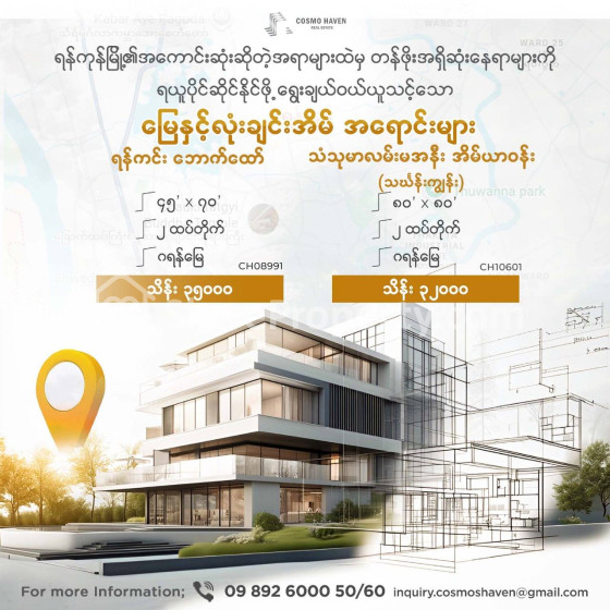 အိမ်ခြံမြေ အမည် : ရန်ကုန်မြိုရှိနေရာကောင်းမြေနှင်လုံးချင်းအိမ်အရောင်းများ/Land Only and Landed House for Sales in Yangon